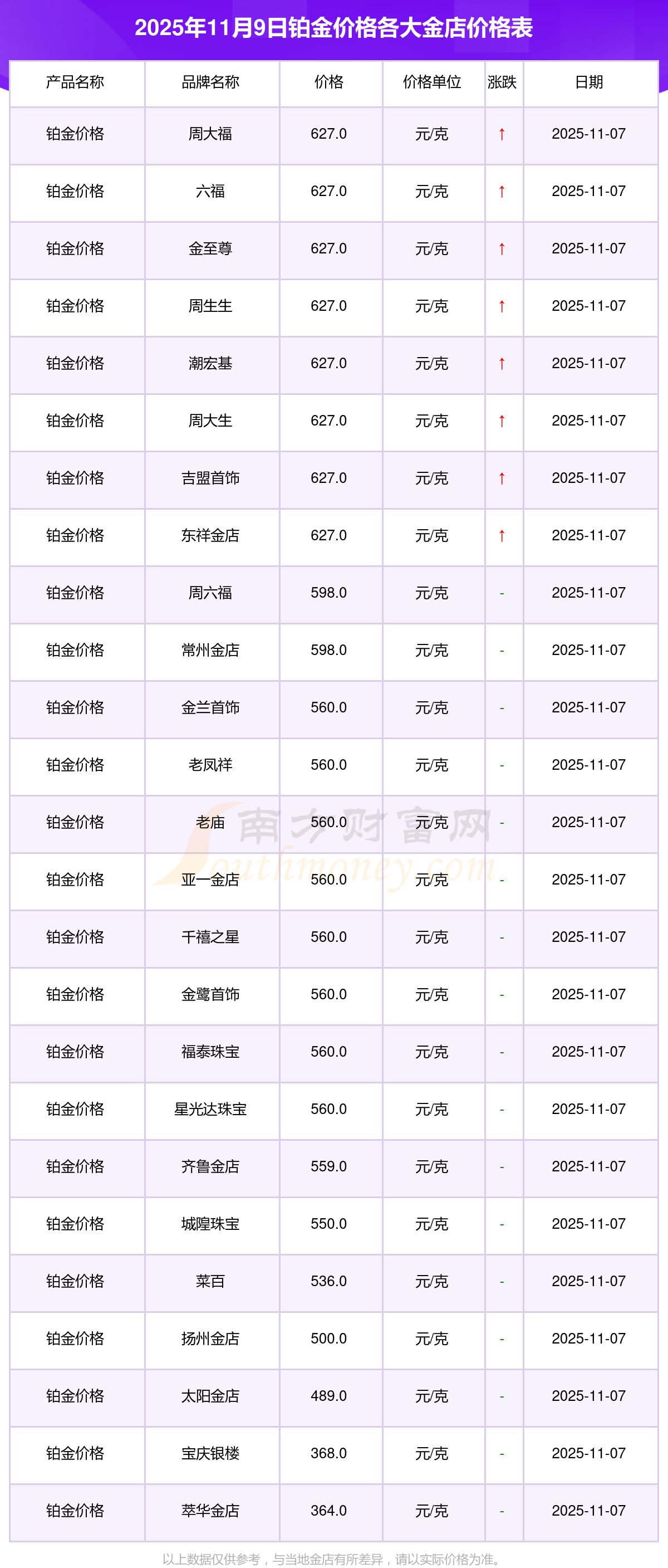 今天是2025年11月9日,寶泉錢幣、金蘭首飾、金蘭首飾、謝瑞麟、謝瑞麟、謝瑞麟、謝瑞麟、謝瑞麟、金銀街、金銀街、金銀街等各大金店品牌鉑金價格最新價格如下:寶泉錢幣11.4元/克、金蘭首飾1263.0元/克、金蘭首飾560.0元/克、謝瑞麟1202.0元/克、謝瑞麟1268.0元/克、謝瑞麟44260.0、謝瑞麟13080.0、謝瑞麟39960.0、金銀街1243.0元/克、金銀街1258.0元/克、金銀街1248.0元/克。