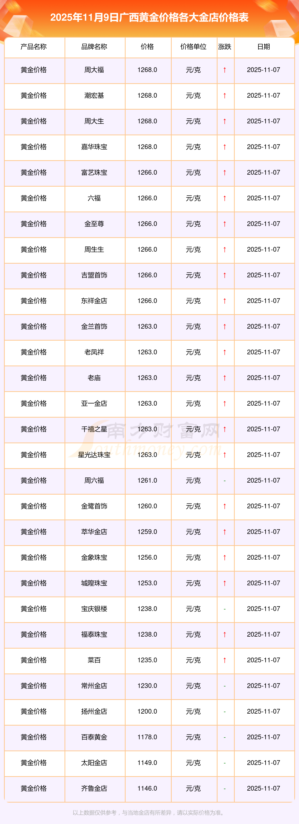 2025年11月9日,廣西寶泉錢(qián)幣、金蘭首飾、金蘭首飾、謝瑞麟、謝瑞麟、謝瑞麟、謝瑞麟、謝瑞麟、金銀街、金銀街、金銀街等各大金店品牌黃金價(jià)格今日價(jià)格如下:寶泉錢(qián)幣11.4元/克、金蘭首飾1263.0元/克、金蘭首飾560.0元/克、謝瑞麟1202.0元/克、謝瑞麟1268.0元/克、謝瑞麟44260.0、謝瑞麟13080.0、謝瑞麟39960.0、金銀街1243.0元/克、金銀街1258.0元/克、金銀街1248.0元/克。