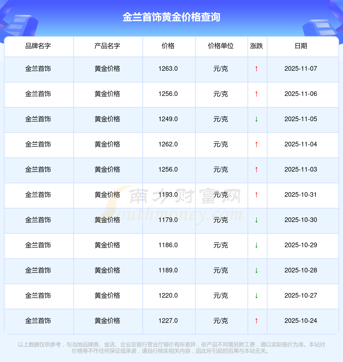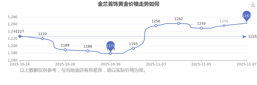 今天黃金價格行情怎樣?此刻每克黃金售價多少?黃金每一克的價格大概是多少?今日金蘭首飾 黃金價格的最新定價為1263.0元/克。