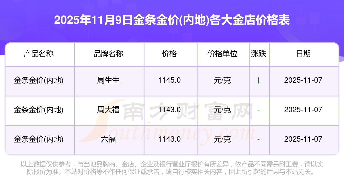 今日金條金價(內(nèi)地)表來了_2025年11月9日各金店金條金價(內(nèi)地)多少一克?最新公布,隨小編來看看。