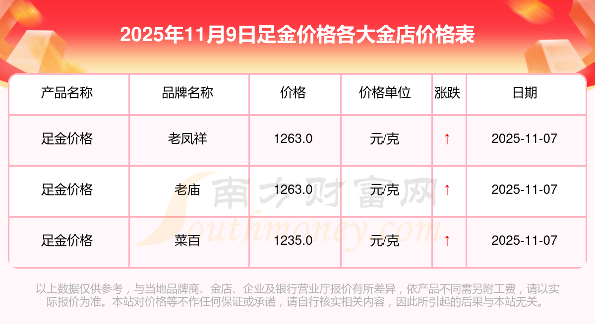 2025年11月9日,寶泉錢幣、金蘭首飾、金蘭首飾、謝瑞麟、謝瑞麟、謝瑞麟、謝瑞麟、謝瑞麟、金銀街、金銀街、金銀街等各大金店品牌足金價格今日價格如下:寶泉錢幣11.4元/克、金蘭首飾1263.0元/克、金蘭首飾560.0元/克、謝瑞麟1202.0元/克、謝瑞麟1268.0元/克、謝瑞麟44260.0、謝瑞麟13080.0、謝瑞麟39960.0、金銀街1243.0元/克、金銀街1258.0元/克、金銀街1248.0元/克。