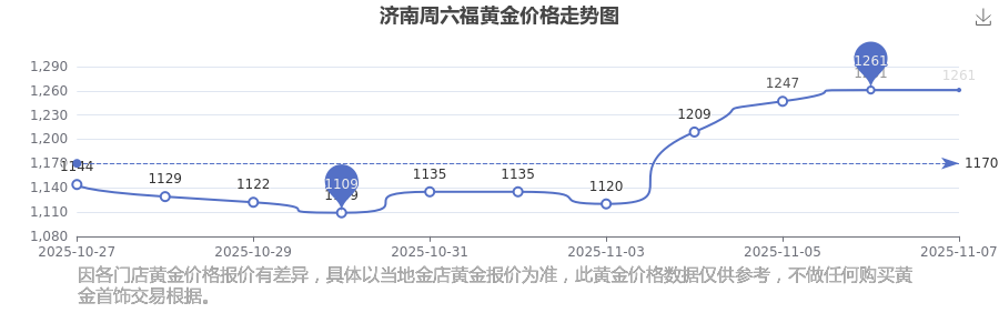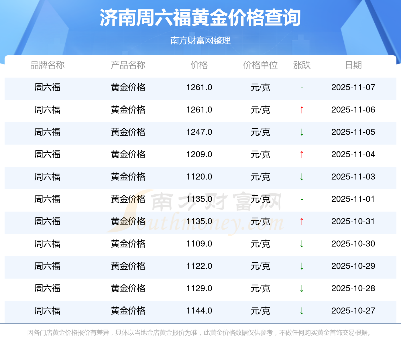 今日(2025年11月9日),濟南周六福黃金價格的價格是1261.0元/克。