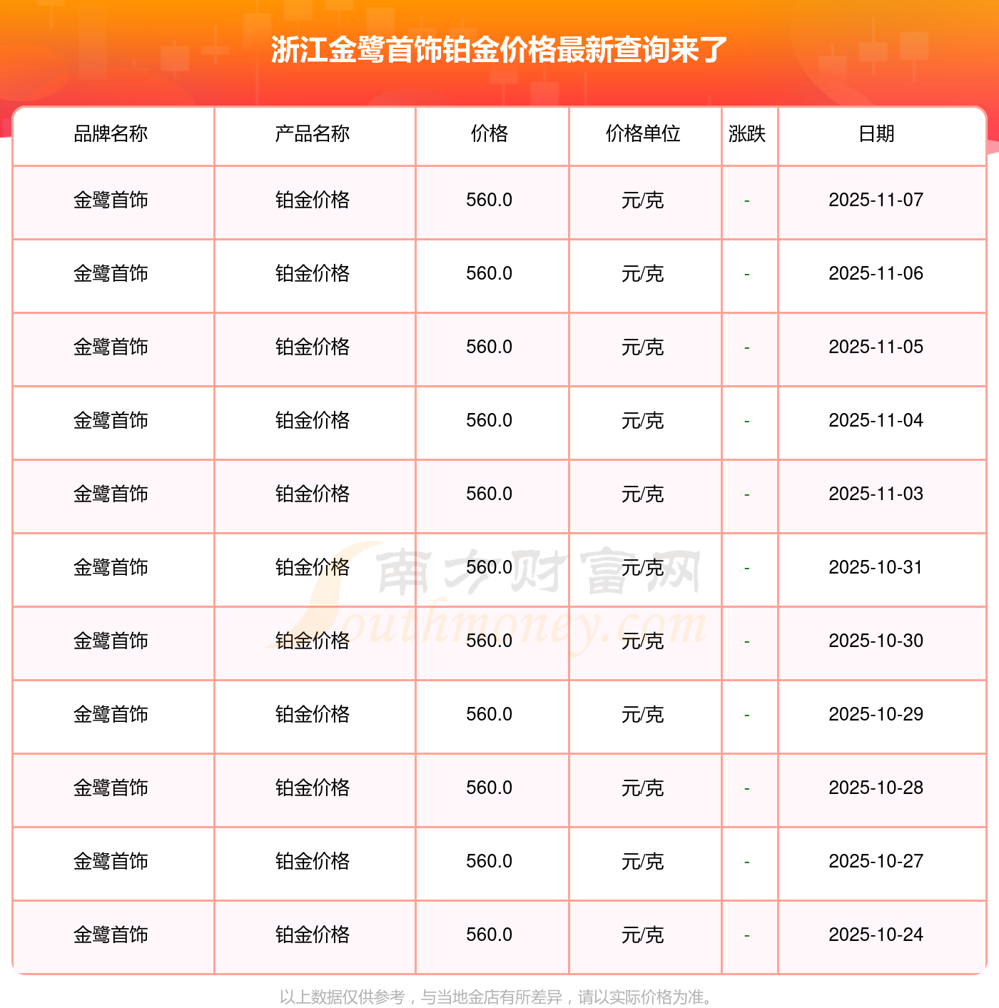 2025年11月9日,浙江金鷺首飾的鉑金價格標價達到 560.0元/克。