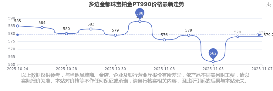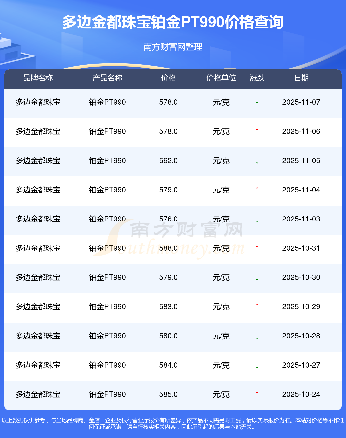 多邊金都珠寶 鉑金PT990今日最新的價(jià)位是578.0元/克。