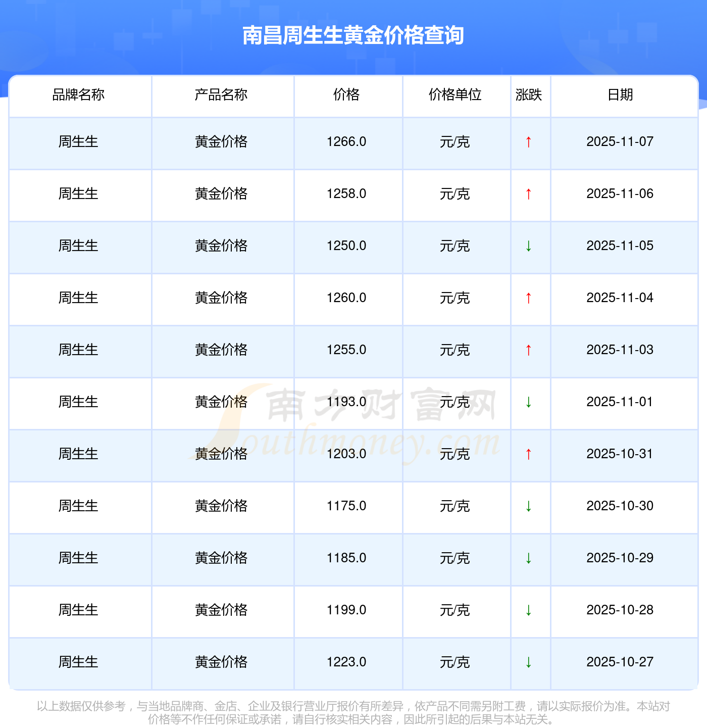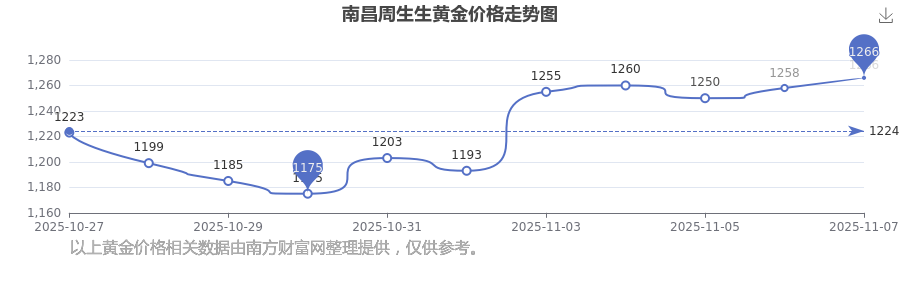 南昌周生生黃金價(jià)格在 2025年11月9日為 1266.0元/克。