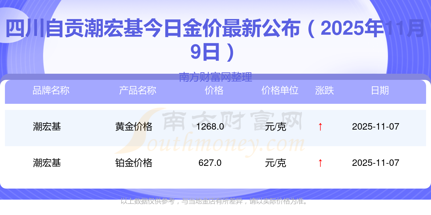 2025年11月9日四川自貢潮宏基黃金一克的市場行情價是多少?銀條價格11.4元/克,黃金價格1263.0元/克,鉑金價格560.0元/克,金條價格(內(nèi)地)1202.0元/克,金飾價格(內(nèi)地)1268.0元/克,黃金飾品(香港)44260.0,鉑金飾品(香港)13080.0,金條金價(香港)39960.0,投資金條1243.0元/克,工藝金條1258.0元/克,千足金首飾1248.0元/克。