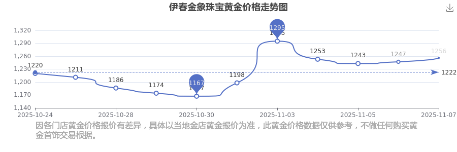 伊春金象珠寶黃金價(jià)格每克多少錢,請(qǐng)問今日一克黃金的零售價(jià)格是多少?今日伊春金象珠寶黃金價(jià)格查詢,2025年11月9日,伊春金象珠寶所售黃金價(jià)格,其價(jià)格設(shè)定為 1256.0元/克。