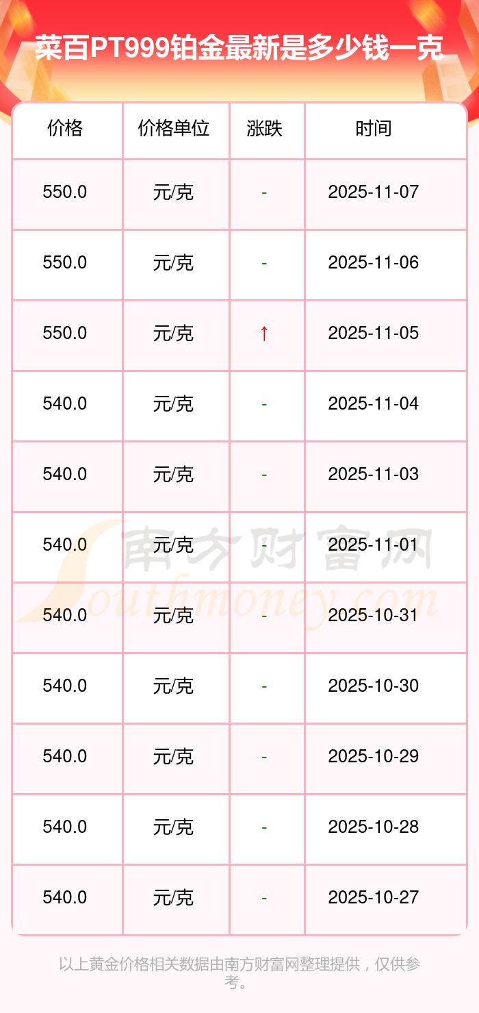 當(dāng)下,菜百 PT999鉑金今日的最新價格是550.0元/克。