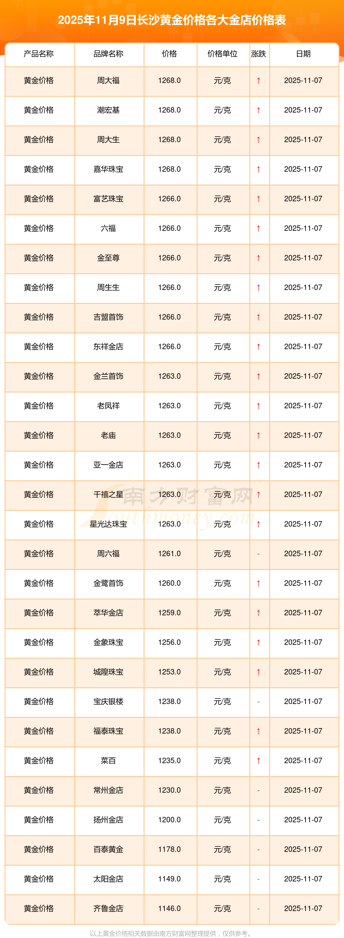 2025年11月9日長沙各大金店黃金價(jià)格最新價(jià)格查詢來了:寶泉錢幣11.4元/克,金蘭首飾1263.0元/克,金蘭首飾560.0元/克,謝瑞麟1202.0元/克,謝瑞麟1268.0元/克,謝瑞麟44260.0,謝瑞麟13080.0,謝瑞麟39960.0,金銀街1243.0元/克,金銀街1258.0元/克,金銀街1248.0元/克。