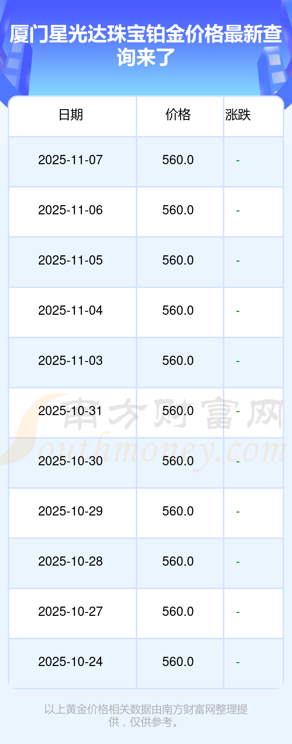 廈門星光達(dá)珠寶 2025年11月9日的鉑金價(jià)格價(jià)位為 560.0元/克。