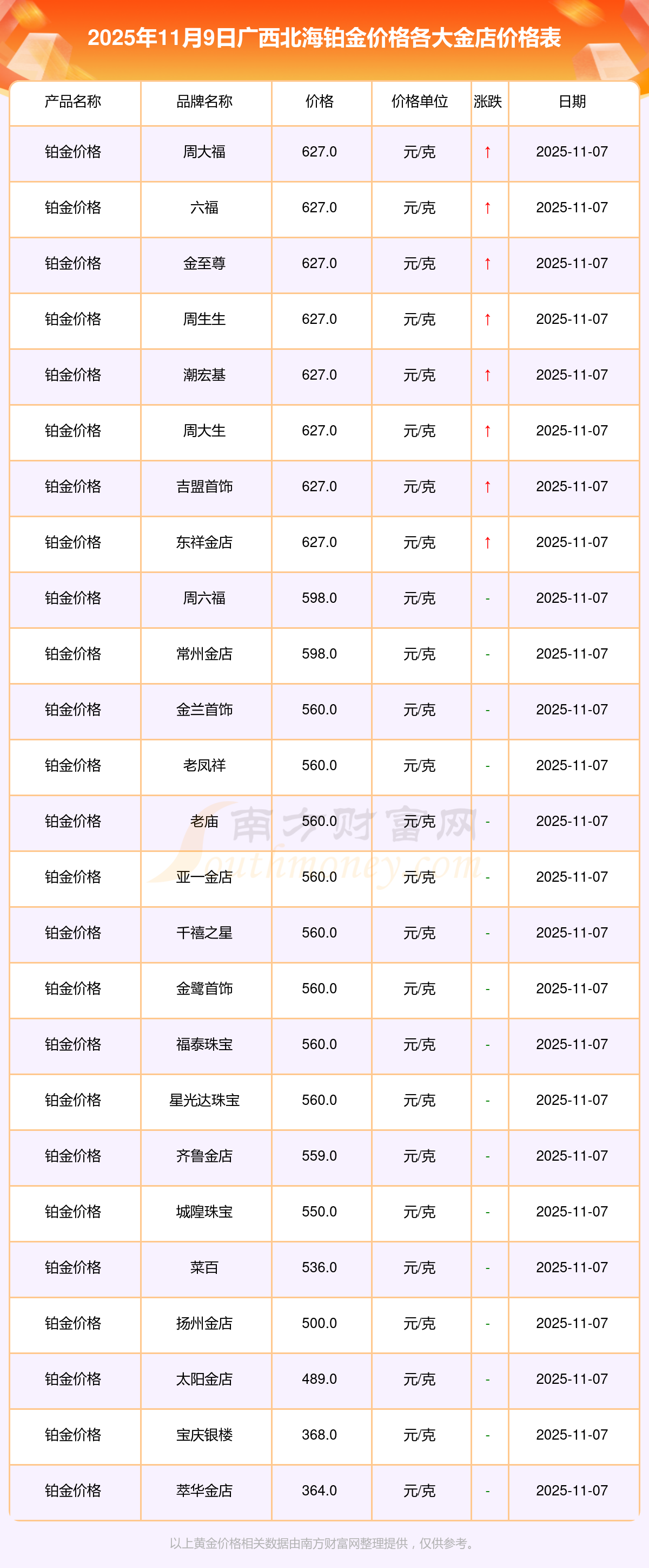 2025年11月9日,廣西北海寶泉錢幣、金蘭首飾、金蘭首飾、謝瑞麟、謝瑞麟、謝瑞麟、謝瑞麟、謝瑞麟、金銀街、金銀街、金銀街等各大金店品牌鉑金價格今日價格行情最新來了:寶泉錢幣11.4元/克、金蘭首飾1263.0元/克、金蘭首飾560.0元/克、謝瑞麟1202.0元/克、謝瑞麟1268.0元/克、謝瑞麟44260.0、謝瑞麟13080.0、謝瑞麟39960.0、金銀街1243.0元/克、金銀街1258.0元/克、金銀街1248.0元/克。