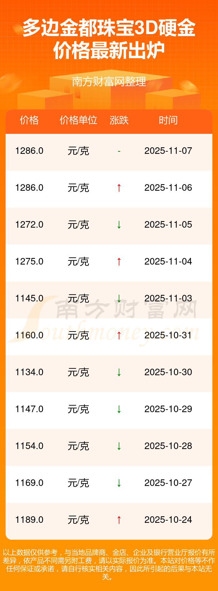 今日(2025年11月9日),多邊金都珠寶3D硬金最新價格是1286.0元/克。