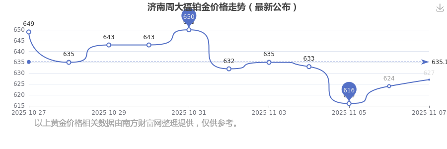 2025年11月9日,濟(jì)南周大福鉑金價(jià)格每克的售賣價(jià)位為627.0元/克。