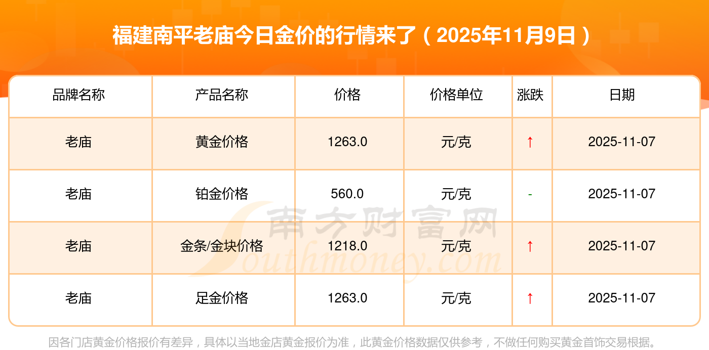 2025年11月9日福建南平老廟一克黃金對(duì)應(yīng)的價(jià)格是多少?銀條價(jià)格11.4元/克,黃金價(jià)格1263.0元/克,鉑金價(jià)格560.0元/克,金條價(jià)格(內(nèi)地)1202.0元/克,金飾價(jià)格(內(nèi)地)1268.0元/克,黃金飾品(香港)44260.0,鉑金飾品(香港)13080.0,金條金價(jià)(香港)39960.0,投資金條1243.0元/克,工藝金條1258.0元/克,千足金首飾1248.0元/克。