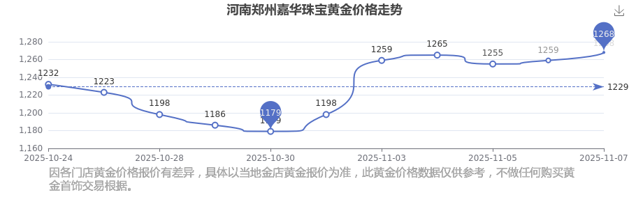 2025年11月9日,河南鄭州嘉華珠寶所售黃金價格,其價格設(shè)定為 1268.0元/克。