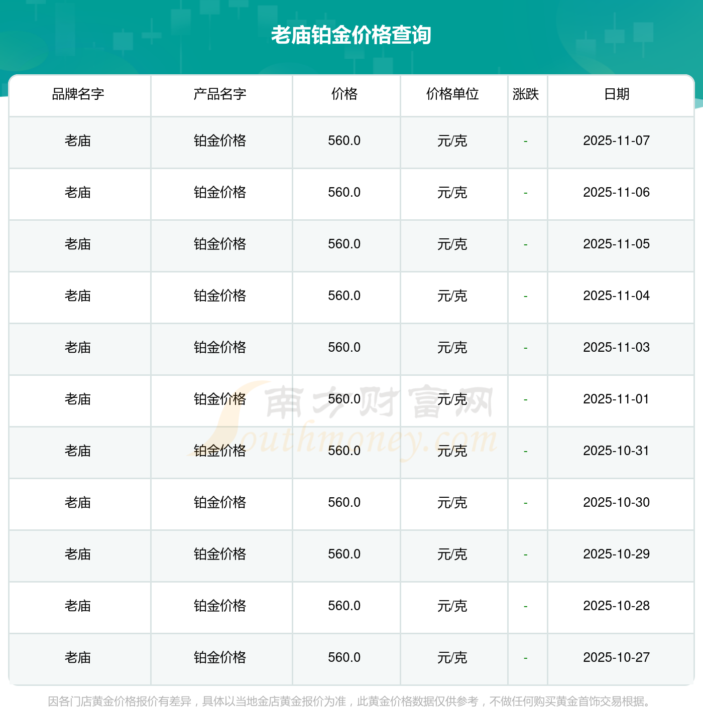 2025年11月9日老廟鉑金價(jià)格:560.0元/克。