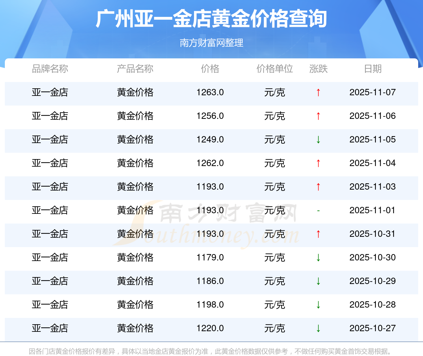 2025年11月9日,廣州亞一金店黃金價格每克的價值量定格在1263.0元/克。