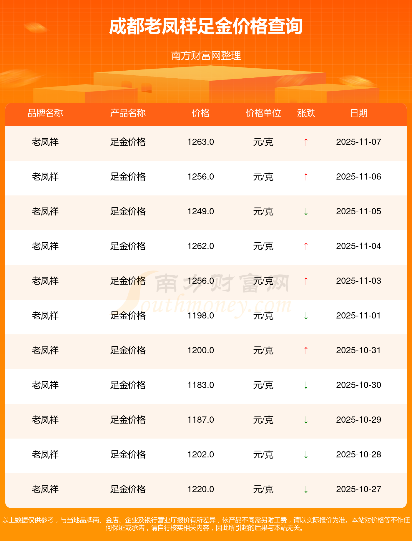 2025年11月9日,寶泉錢幣、金蘭首飾、金蘭首飾、謝瑞麟、謝瑞麟、謝瑞麟、謝瑞麟、謝瑞麟、金銀街、金銀街、金銀街等各大金店品牌足金價(jià)格今日價(jià)格如下:寶泉錢幣11.4元/克、金蘭首飾1263.0元/克、金蘭首飾560.0元/克、謝瑞麟1202.0元/克、謝瑞麟1268.0元/克、謝瑞麟44260.0、謝瑞麟13080.0、謝瑞麟39960.0、金銀街1243.0元/克、金銀街1258.0元/克、金銀街1248.0元/克。