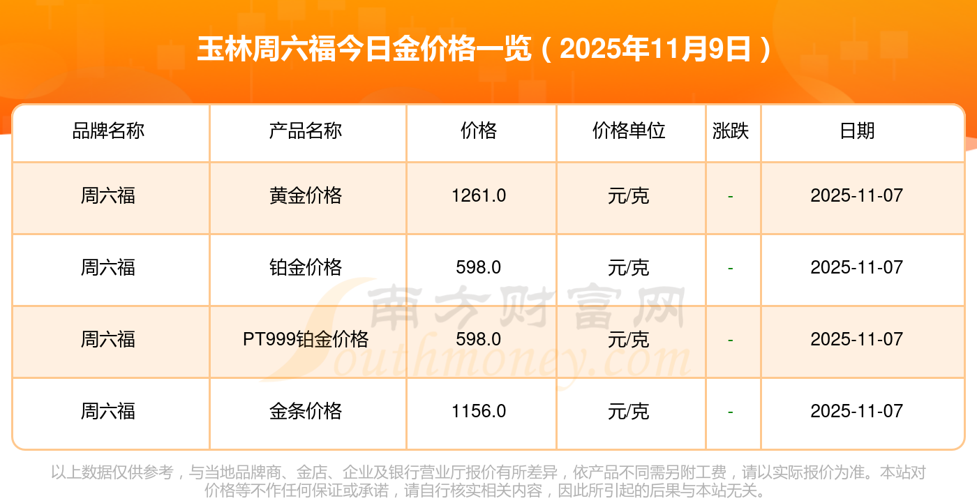 2025年11月9日玉林周六福黃金的單價,一克為多少?銀條價格11.4元/克,黃金價格1263.0元/克,鉑金價格560.0元/克,金條價格(內地)1202.0元/克,金飾價格(內地)1268.0元/克,黃金飾品(香港)44260.0,鉑金飾品(香港)13080.0,金條金價(香港)39960.0,投資金條1243.0元/克,工藝金條1258.0元/克,千足金首飾1248.0元/克。