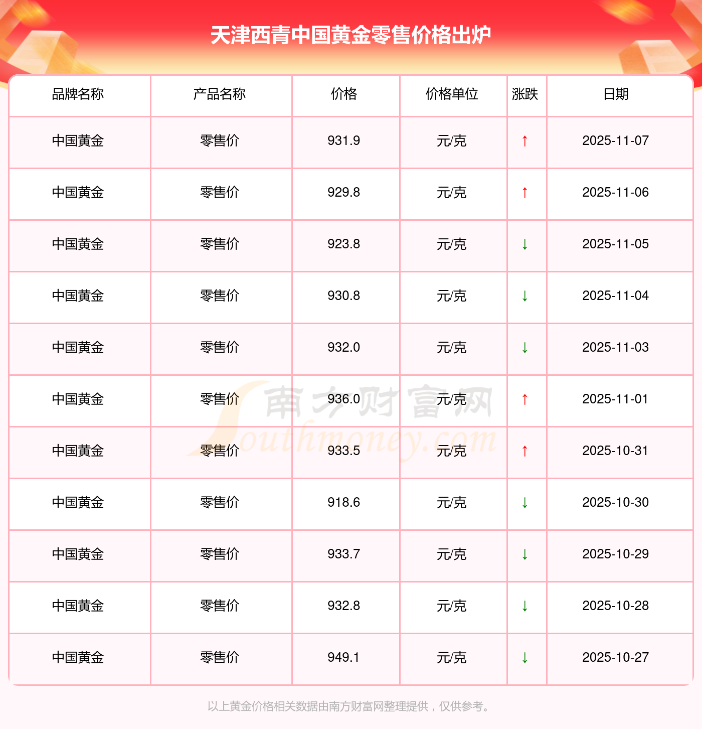 天津西青中國黃金零售價格在 2025年11月9日為 931.9元/克。