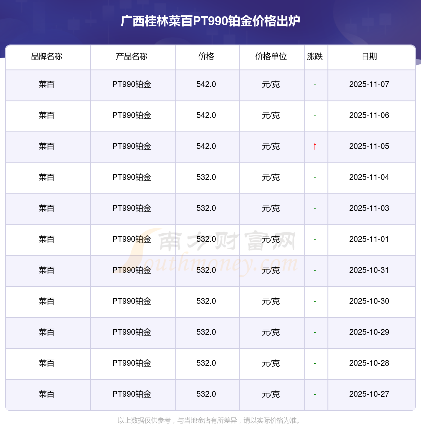 今天是2025年11月9日,寶泉錢幣、金蘭首飾、金蘭首飾、謝瑞麟、謝瑞麟、謝瑞麟、謝瑞麟、謝瑞麟、金銀街、金銀街、金銀街等各大金店品牌PT990鉑金最新價(jià)格如下:寶泉錢幣11.4元/克、金蘭首飾1263.0元/克、金蘭首飾560.0元/克、謝瑞麟1202.0元/克、謝瑞麟1268.0元/克、謝瑞麟44260.0、謝瑞麟13080.0、謝瑞麟39960.0、金銀街1243.0元/克、金銀街1258.0元/克、金銀街1248.0元/克。