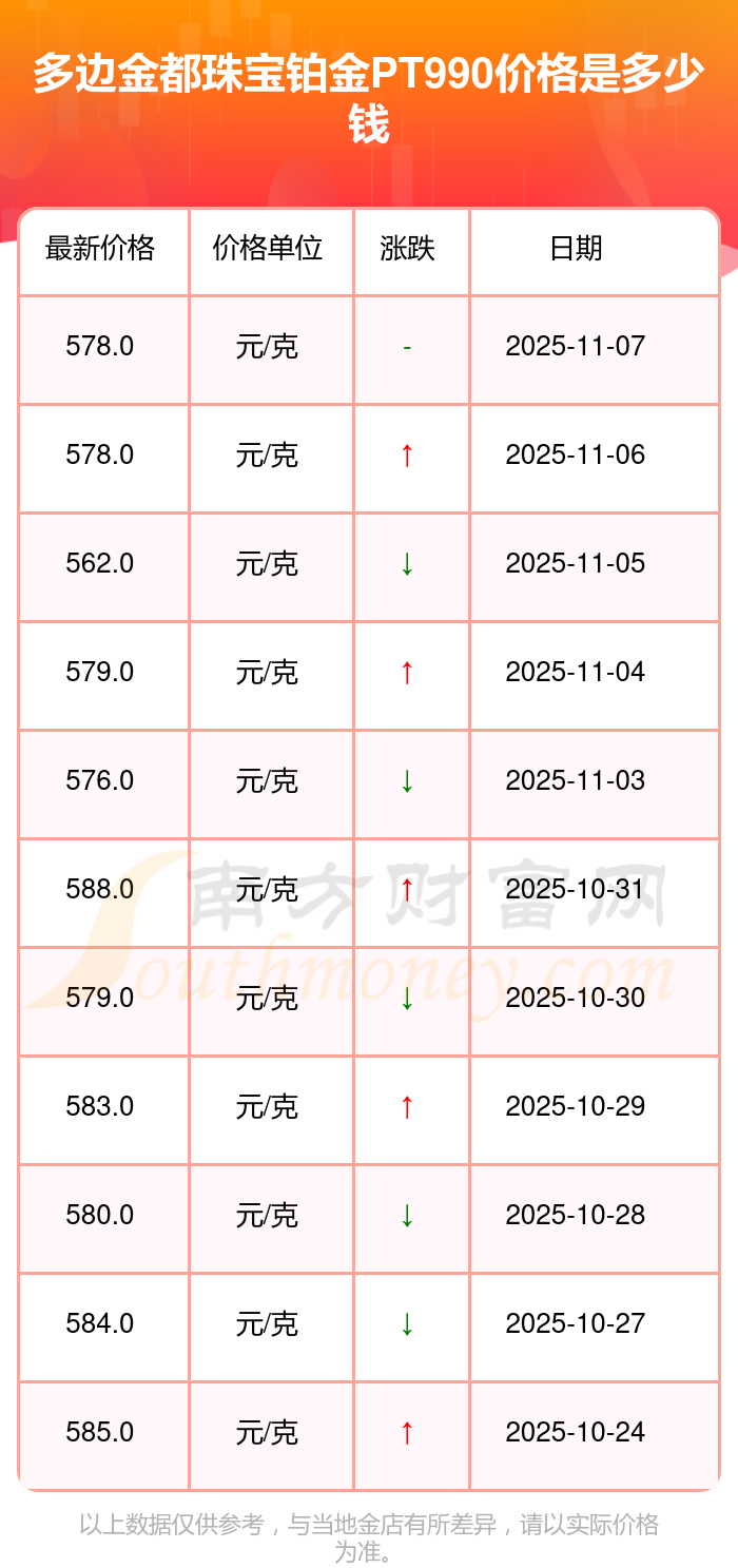 今日多邊金都珠寶 鉑金PT990最新的克重售價(jià)為578.0元/克。
