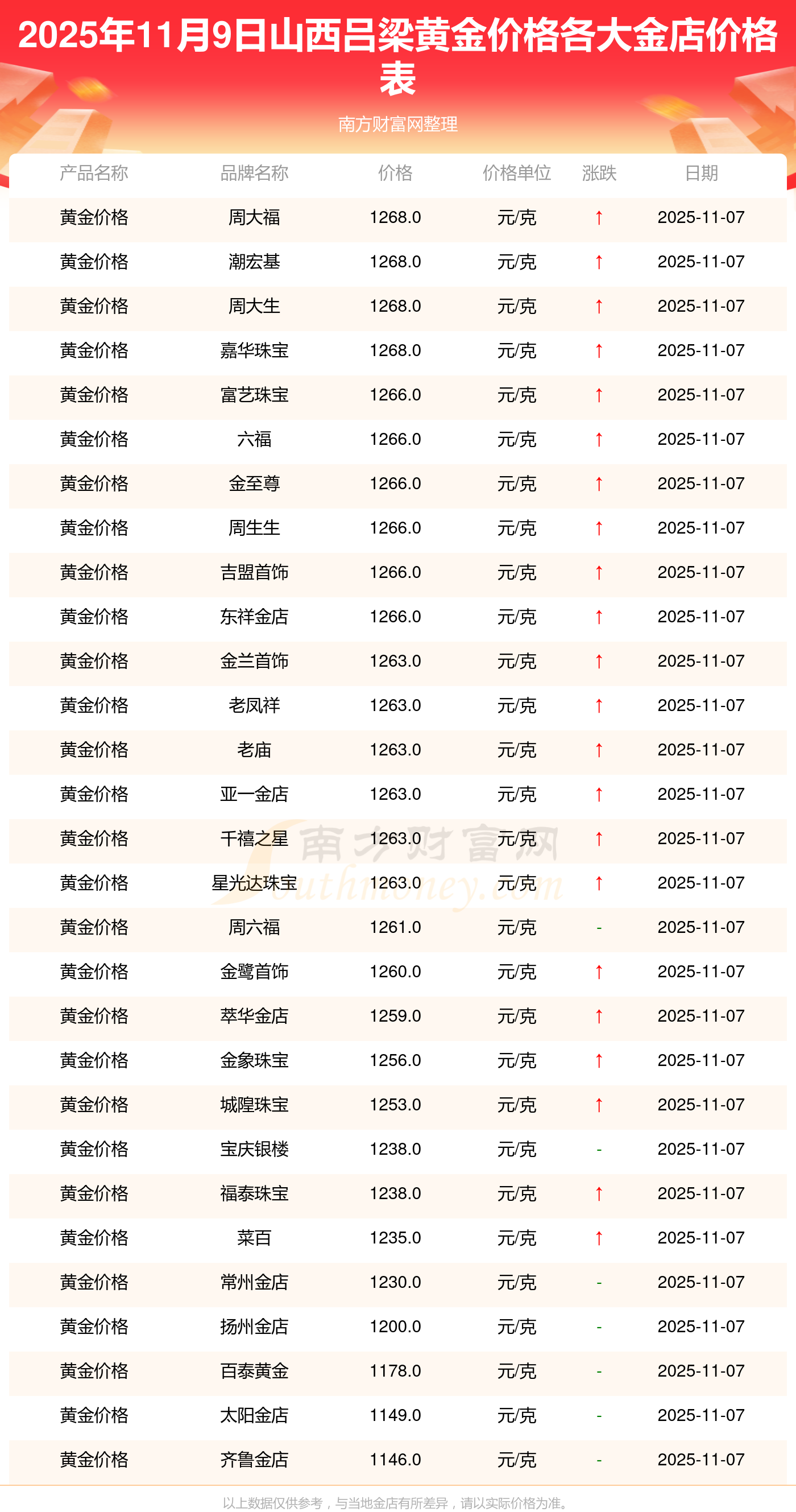 今天是2025年11月9日,山西呂梁寶泉錢幣、金蘭首飾、金蘭首飾、謝瑞麟、謝瑞麟、謝瑞麟、謝瑞麟、謝瑞麟、金銀街、金銀街、金銀街等各大金店品牌黃金價格最新價格行情是這樣的:寶泉錢幣11.4元/克、金蘭首飾1263.0元/克、金蘭首飾560.0元/克、謝瑞麟1202.0元/克、謝瑞麟1268.0元/克、謝瑞麟44260.0、謝瑞麟13080.0、謝瑞麟39960.0、金銀街1243.0元/克、金銀街1258.0元/克、金銀街1248.0元/克。