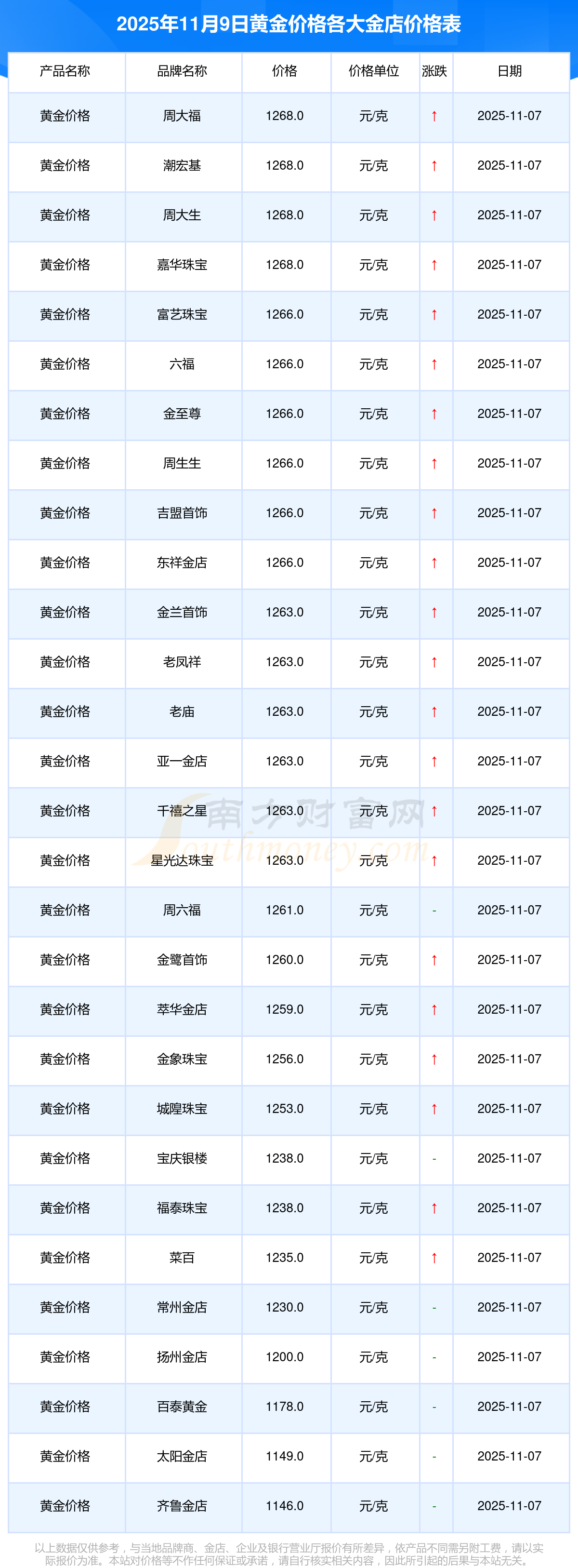 今天是2025年11月9日,寶泉錢幣、金蘭首飾、金蘭首飾、謝瑞麟、謝瑞麟、謝瑞麟、謝瑞麟、謝瑞麟、金銀街、金銀街、金銀街等各大金店品牌黃金價(jià)格最新價(jià)格如下:寶泉錢幣11.4元/克、金蘭首飾1263.0元/克、金蘭首飾560.0元/克、謝瑞麟1202.0元/克、謝瑞麟1268.0元/克、謝瑞麟44260.0、謝瑞麟13080.0、謝瑞麟39960.0、金銀街1243.0元/克、金銀街1258.0元/克、金銀街1248.0元/克。