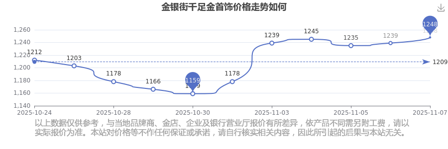 今日金銀街千足金首飾價格最新是1248.0元/克。