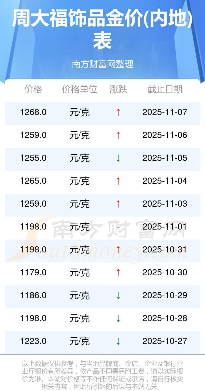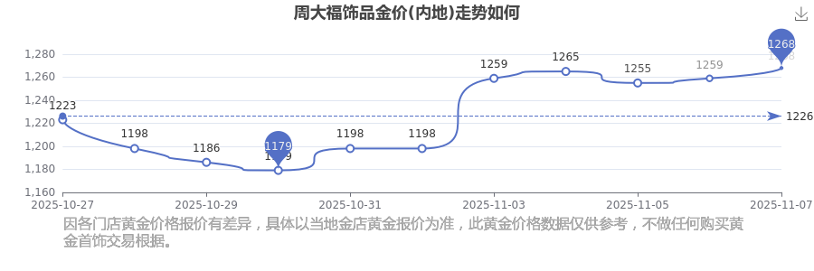 今日(2025年11月9日)周大福飾品金價(內(nèi)地):1268.0元/克。