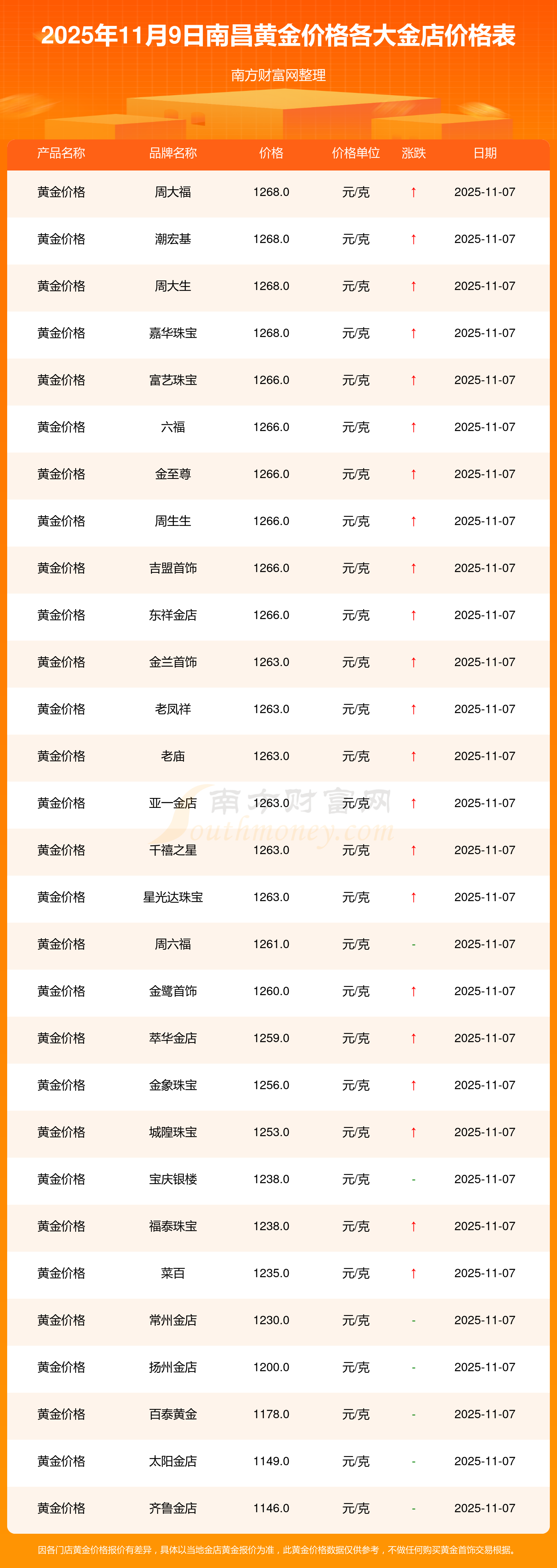 2025年11月9日南昌寶泉錢幣、金蘭首飾、金蘭首飾、謝瑞麟、謝瑞麟、謝瑞麟、謝瑞麟、謝瑞麟、金銀街、金銀街、金銀街等各大金店品牌黃金價格最新價格行情來了,如下:寶泉錢幣銀條價格11.4元/克,金蘭首飾黃金價格1263.0元/克,金蘭首飾鉑金價格560.0元/克,謝瑞麟金條價格(內(nèi)地)1202.0元/克,謝瑞麟金飾價格(內(nèi)地)1268.0元/克,謝瑞麟黃金飾品(香港)44260.0,謝瑞麟鉑金飾品(香港)13080.0,謝瑞麟金條金價(香港)39960.0,金銀街投資金條1243.0元/克,金銀街工藝金條1258.0元/克,金銀街千足金首飾1248.0元/克。