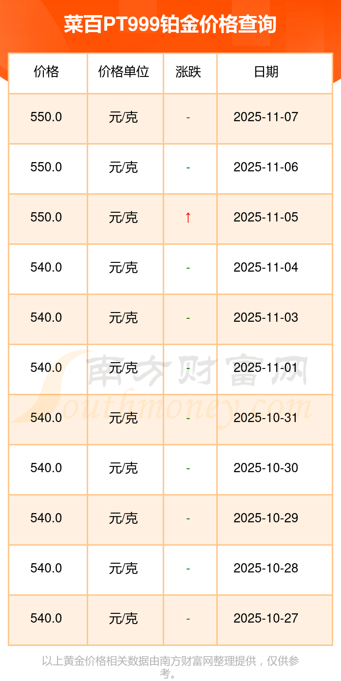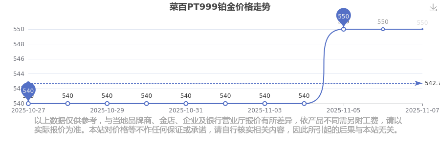 最新數(shù)據(jù)表明,菜百今日 PT999鉑金價格為550.0元/克。
