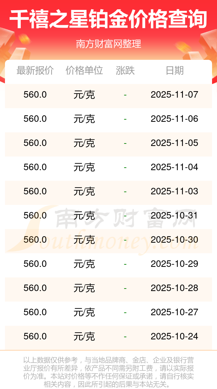 今日千禧之星鉑金價(jià)格為560.0元/克。