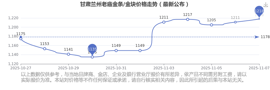 甘肅蘭州老廟在 2025年11月9日,金條/金塊價(jià)格的售賣價(jià)格是 1218.0元/克。