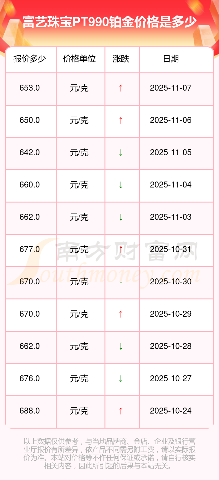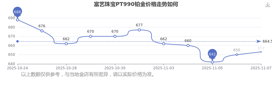 今日(2025年11月9日),富藝珠寶PT990鉑金最新價格為653.0元/克。