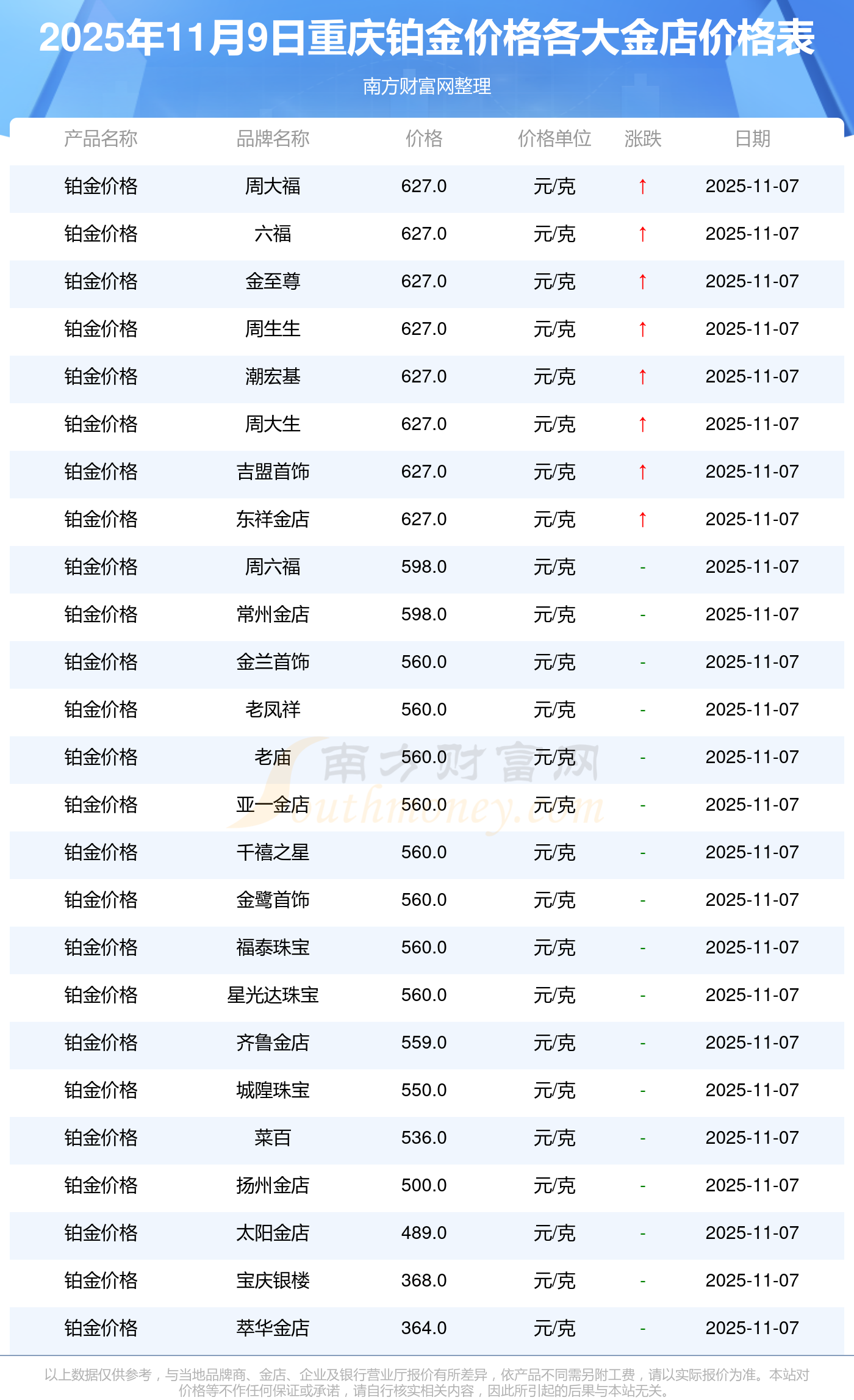 今天是2025年11月9日,重慶寶泉錢幣、金蘭首飾、金蘭首飾、謝瑞麟、謝瑞麟、謝瑞麟、謝瑞麟、謝瑞麟、金銀街、金銀街、金銀街等各大金店品牌鉑金價格最新價格如下:寶泉錢幣11.4元/克、金蘭首飾1263.0元/克、金蘭首飾560.0元/克、謝瑞麟1202.0元/克、謝瑞麟1268.0元/克、謝瑞麟44260.0、謝瑞麟13080.0、謝瑞麟39960.0、金銀街1243.0元/克、金銀街1258.0元/克、金銀街1248.0元/克。