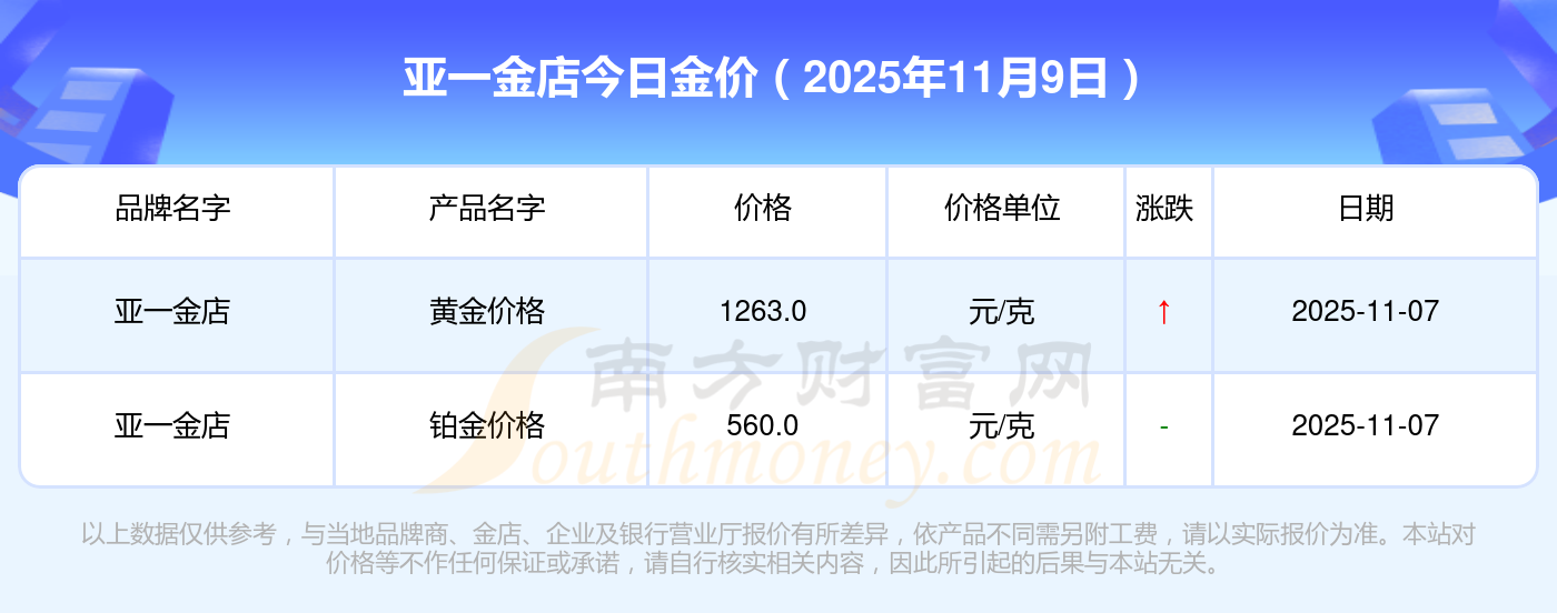 2025年11月9日亞一金店今日價格:銀條價格11.4元/克,黃金價格1263.0元/克,鉑金價格560.0元/克,金條價格(內地)1202.0元/克,金飾價格(內地)1268.0元/克,黃金飾品(香港)44260.0,鉑金飾品(香港)13080.0,金條金價(香港)39960.0,投資金條1243.0元/克,工藝金條1258.0元/克,千足金首飾1248.0元/克。