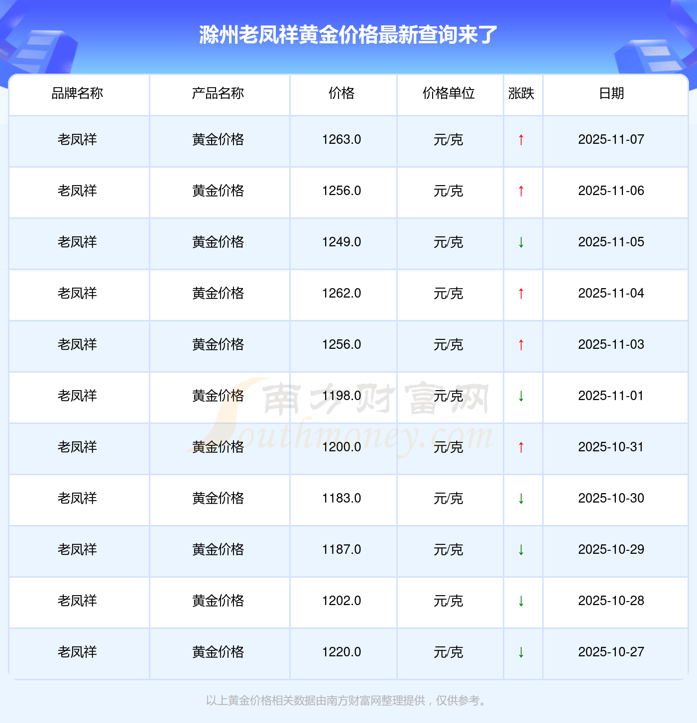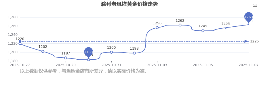2025年11月9日滁州老鳳祥黃金價格:1263.0元/克。