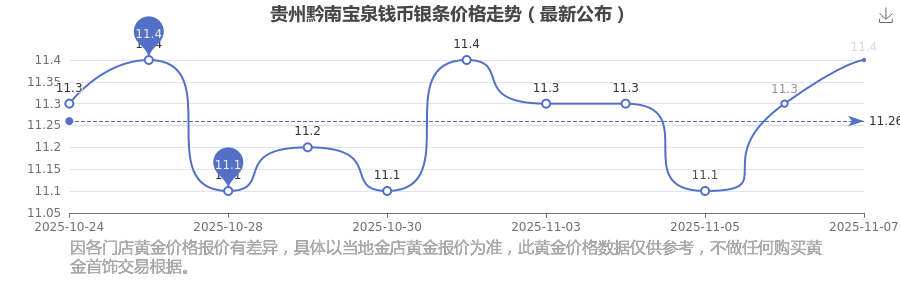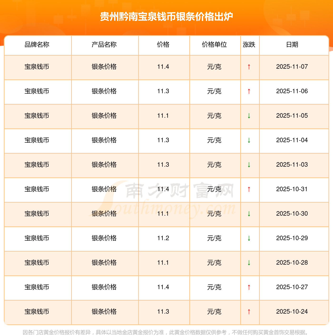 今日貴州黔南寶泉錢幣銀條價格為11.4元/克。