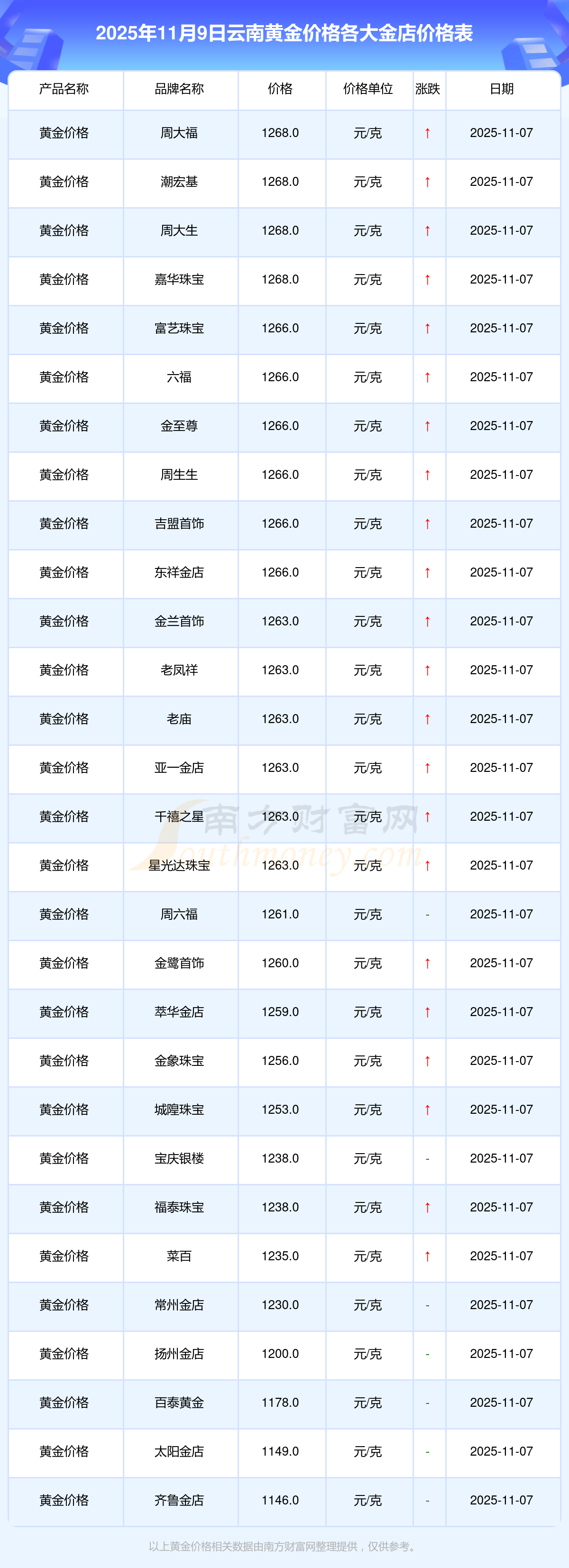 2025年11月9日云南各大金店黃金價(jià)格最新價(jià)格:寶泉錢幣11.4元/克,金蘭首飾1263.0元/克,金蘭首飾560.0元/克,謝瑞麟1202.0元/克,謝瑞麟1268.0元/克,謝瑞麟44260.0,謝瑞麟13080.0,謝瑞麟39960.0,金銀街1243.0元/克,金銀街1258.0元/克,金銀街1248.0元/克。
