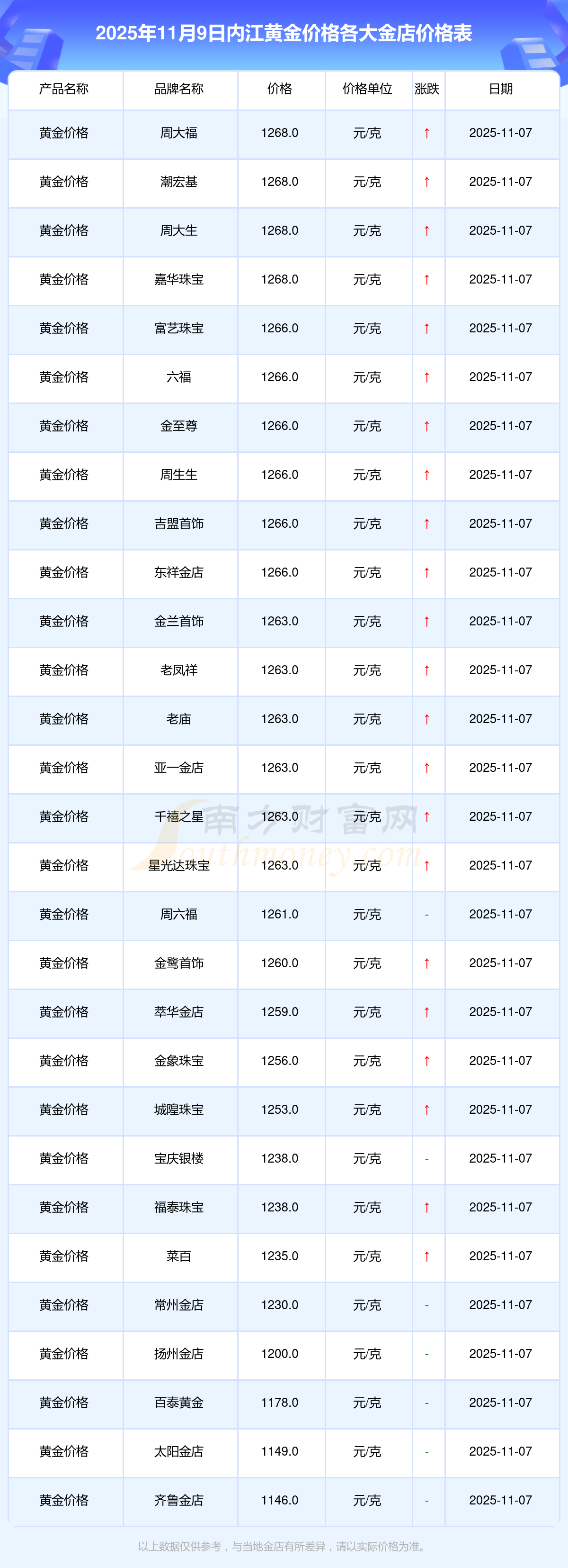 一、內(nèi)江各金店黃金價格表最新是多少錢,黃金價格今天多少一克,今天最新的黃金每克價格的表單樣式是怎樣的