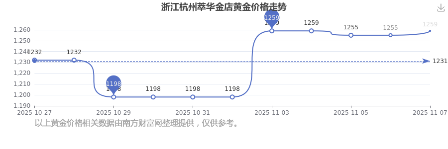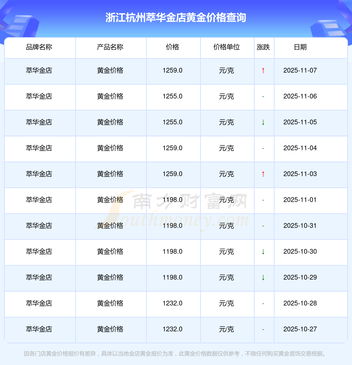 浙江杭州萃華金店今日黃金價(jià)格(今天黃金一克的售賣價(jià)格是多少)?今日浙江杭州萃華金店黃金價(jià)格查詢,2025年11月9日浙江杭州萃華金店黃金價(jià)格是1259.0元/克。