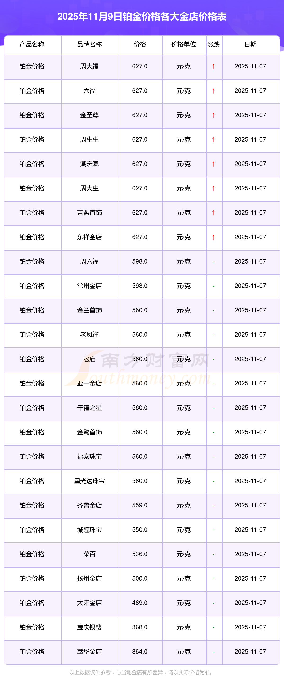 今天是2025年11月9日,寶泉錢幣、金蘭首飾、金蘭首飾、謝瑞麟、謝瑞麟、謝瑞麟、謝瑞麟、謝瑞麟、金銀街、金銀街、金銀街等各大金店品牌鉑金價(jià)格最新價(jià)格如下:寶泉錢幣11.4元/克、金蘭首飾1263.0元/克、金蘭首飾560.0元/克、謝瑞麟1202.0元/克、謝瑞麟1268.0元/克、謝瑞麟44260.0、謝瑞麟13080.0、謝瑞麟39960.0、金銀街1243.0元/克、金銀街1258.0元/克、金銀街1248.0元/克。