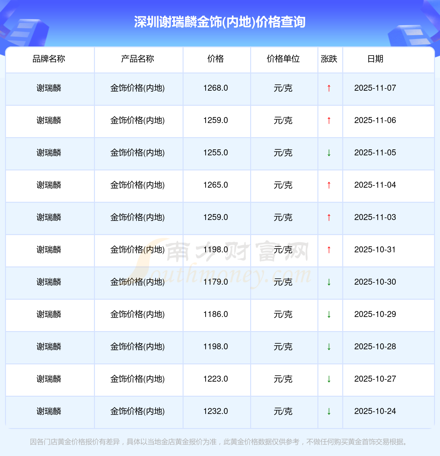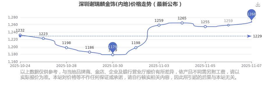 今日(2025年11月9日),1268.0元/克是深圳謝瑞麟金飾價格(內(nèi)地)的價格標(biāo)準(zhǔn)。