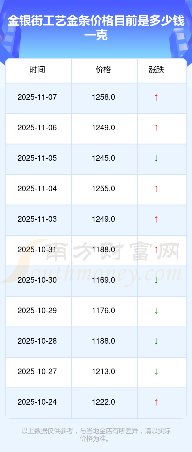 據(jù)了解,金銀街今日工藝金條價格為1258.0元/克。