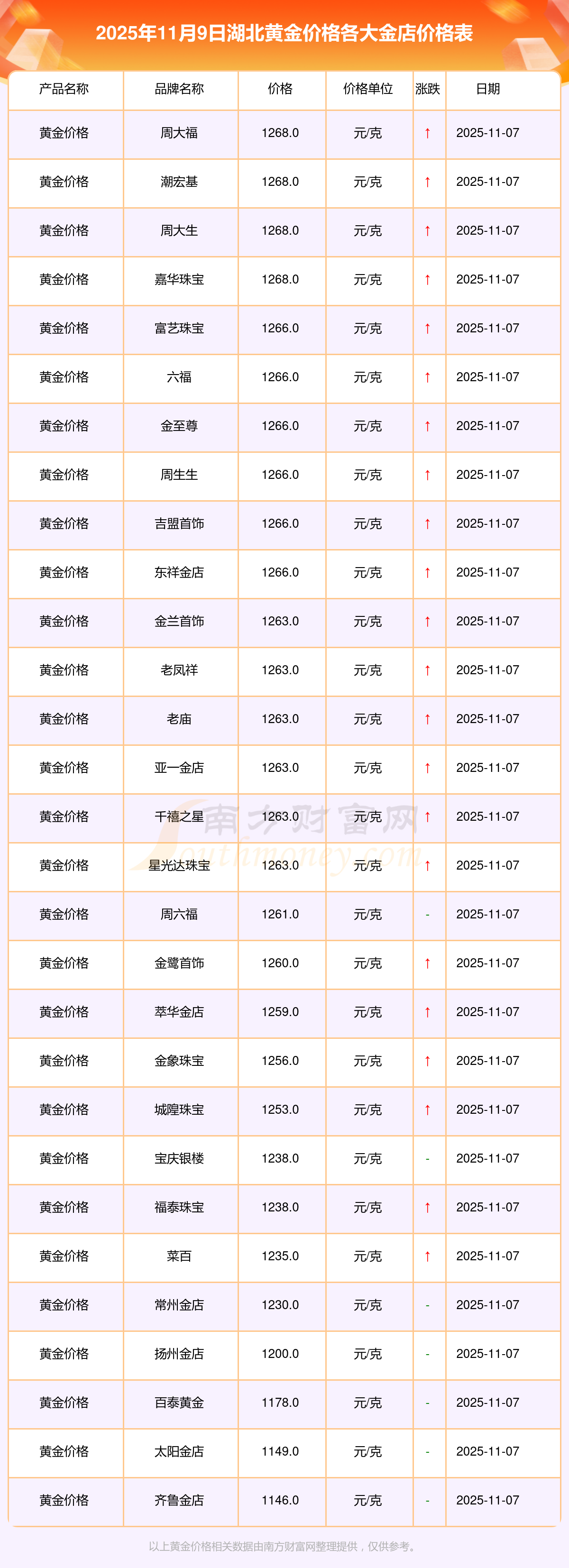 2025年11月9日湖北各大金店黃金價(jià)格最新價(jià)格查詢(xún)來(lái)了:寶泉錢(qián)幣11.4元/克,金蘭首飾1263.0元/克,金蘭首飾560.0元/克,謝瑞麟1202.0元/克,謝瑞麟1268.0元/克,謝瑞麟44260.0,謝瑞麟13080.0,謝瑞麟39960.0,金銀街1243.0元/克,金銀街1258.0元/克,金銀街1248.0元/克。