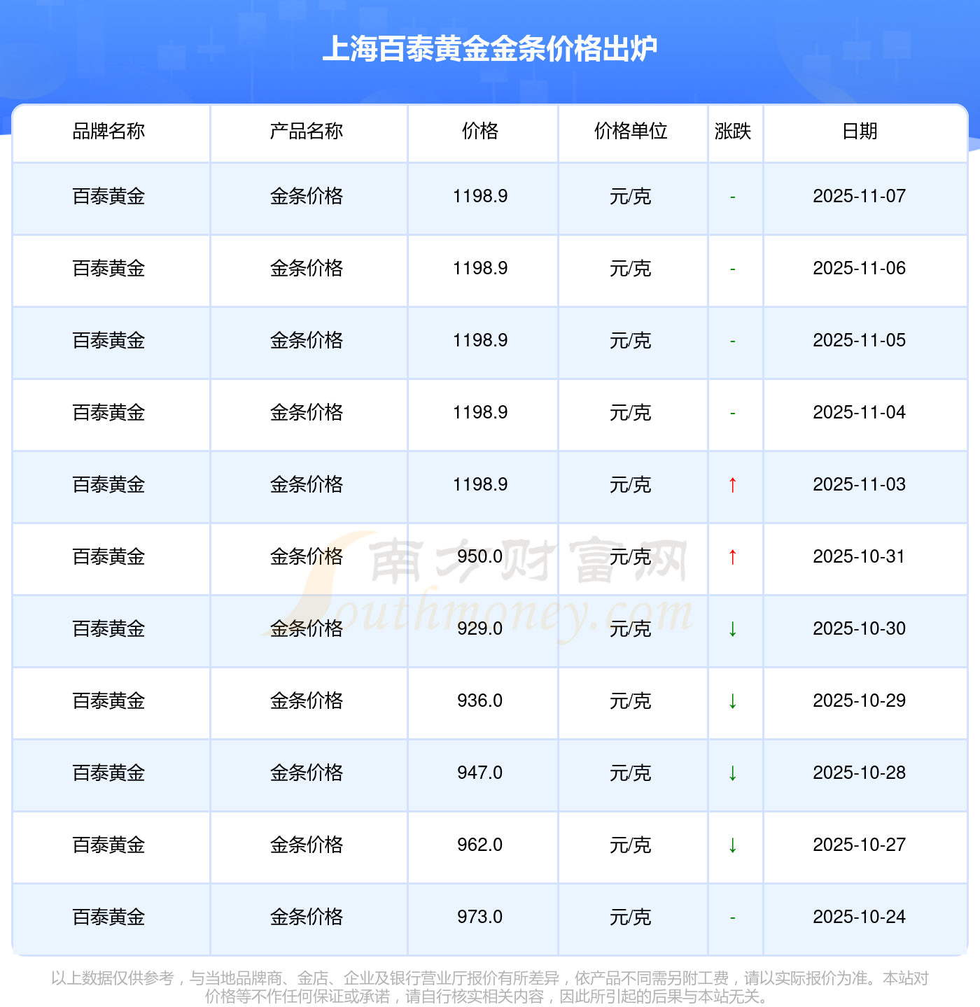 2025年11月9日,上海百泰黃金的金條價(jià)格標(biāo)價(jià)達(dá)到 1198.9元/克。