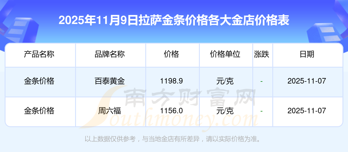 2025年11月9日拉薩寶泉錢幣、金蘭首飾、金蘭首飾、謝瑞麟、謝瑞麟、謝瑞麟、謝瑞麟、謝瑞麟、金銀街、金銀街、金銀街等各大金店品牌金條價格最新價格行情來了,如下:寶泉錢幣銀條價格11.4元/克,金蘭首飾黃金價格1263.0元/克,金蘭首飾鉑金價格560.0元/克,謝瑞麟金條價格(內(nèi)地)1202.0元/克,謝瑞麟金飾價格(內(nèi)地)1268.0元/克,謝瑞麟黃金飾品(香港)44260.0,謝瑞麟鉑金飾品(香港)13080.0,謝瑞麟金條金價(香港)39960.0,金銀街投資金條1243.0元/克,金銀街工藝金條1258.0元/克,金銀街千足金首飾1248.0元/克。