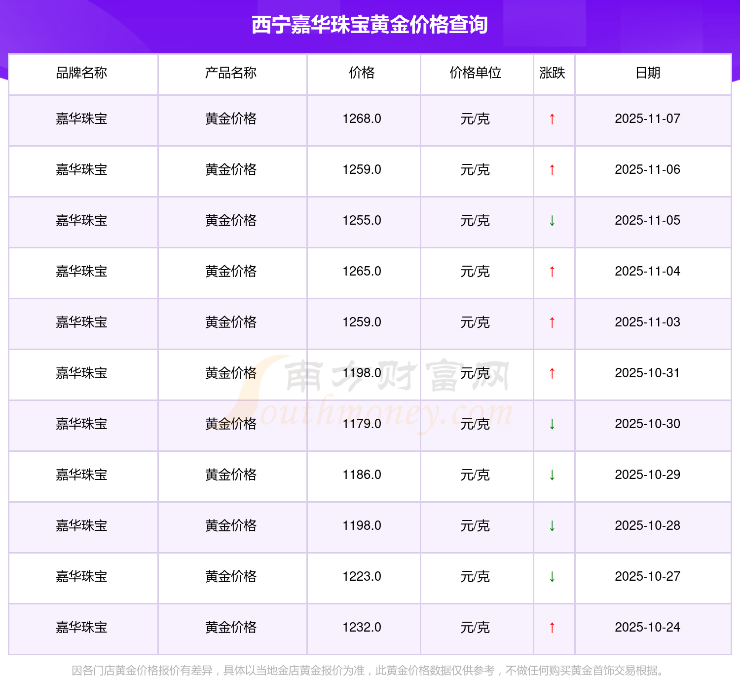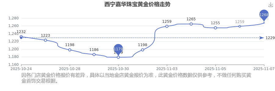 西寧嘉華珠寶在 2025年11月9日的黃金價(jià)格零售價(jià)格為 1268.0元/克。