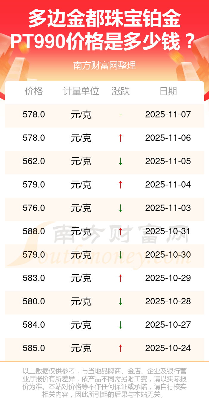 578.0元/克是多邊金都珠寶在今日給出的 鉑金PT990最新價(jià)格。